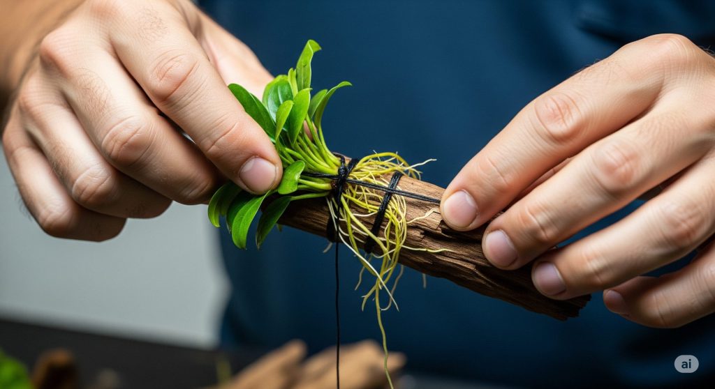 - 根茎を中心に、木綿糸やビニタイをぐるぐると巻き付けて固定します。