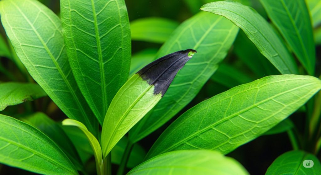 これは最もよくあるトラブルです。高水温や水質の悪化が引き金となる「シダ病」は、葉先から透明~黒色になって溶けるように枯れていく病気です。 対策としては、黒くなった部分を迷わずカットすること。放置すると他の葉にも広がる可能性があります。早めに切り取り、定期的な水換えで水質をきれいに保つことを心がけてください。